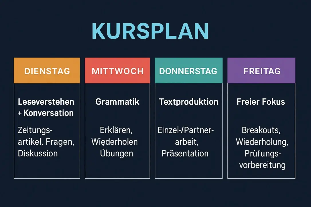 In unserem B2-Intensivkurs tauchen Sie tief in die deutsche Sprache ein. Der Kurs deckt folgende Themen ab: